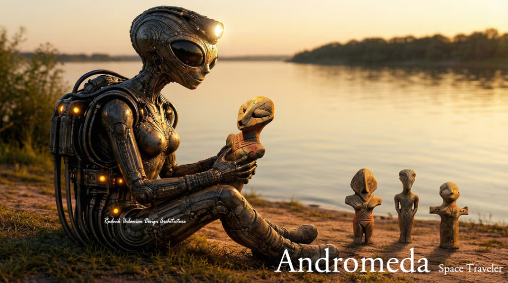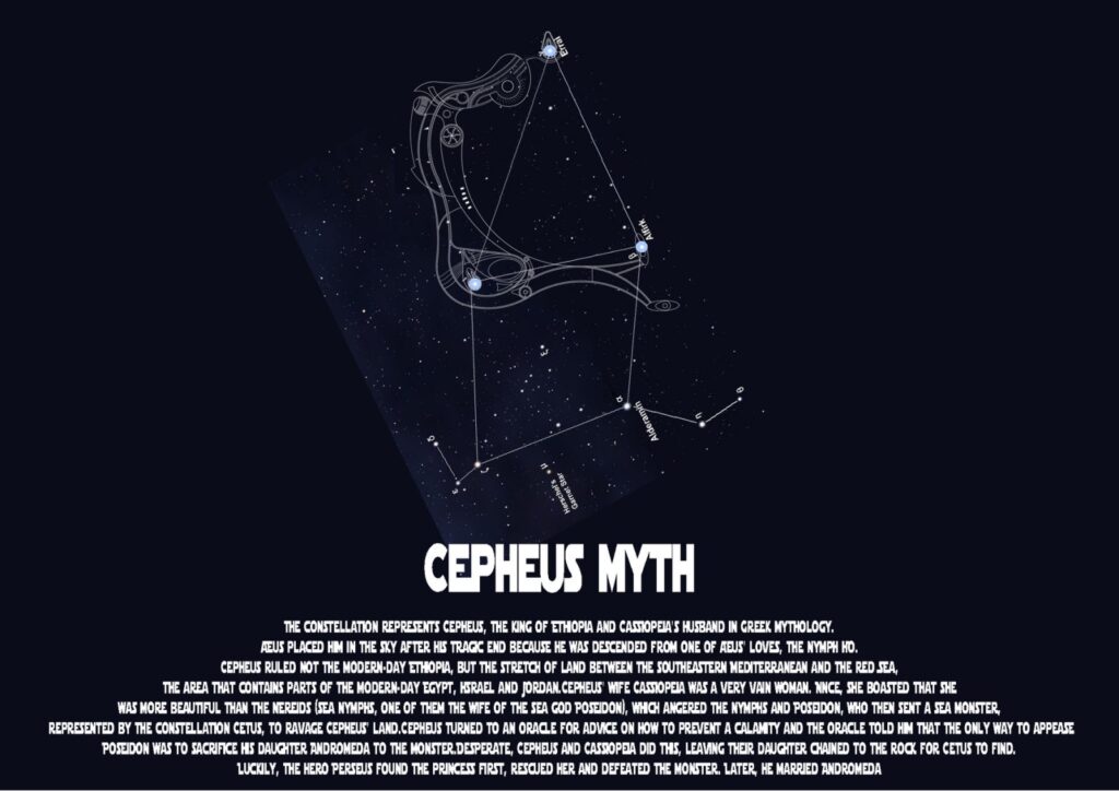 Концептуални оквир решења додатно је развијен кроз наратив Андромеда, кћери Кефеја, чиме се успоставља слојевита веза између космолошке симболике и локалног контекста. У митолошкој интерпретацији, Андромеда, жртвована услед казне намењене њеној мајци Касиопеји, овде се реинтерпретира као симболички „космички путник“ који доспева на обалу Дунава.
